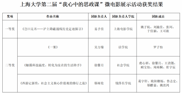为深入贯彻落实习近平总书记关于“大思政课”建设的重要指示精神,充分发挥高校思政课立德树人关键课程作用,坚持不懈用习近平新时代中国特色社会主义思想铸魂育人,近期,我校顺利开展上海大学第二届“我心中的思政课”微电影评选展示活动。现将获奖名单公布如下: