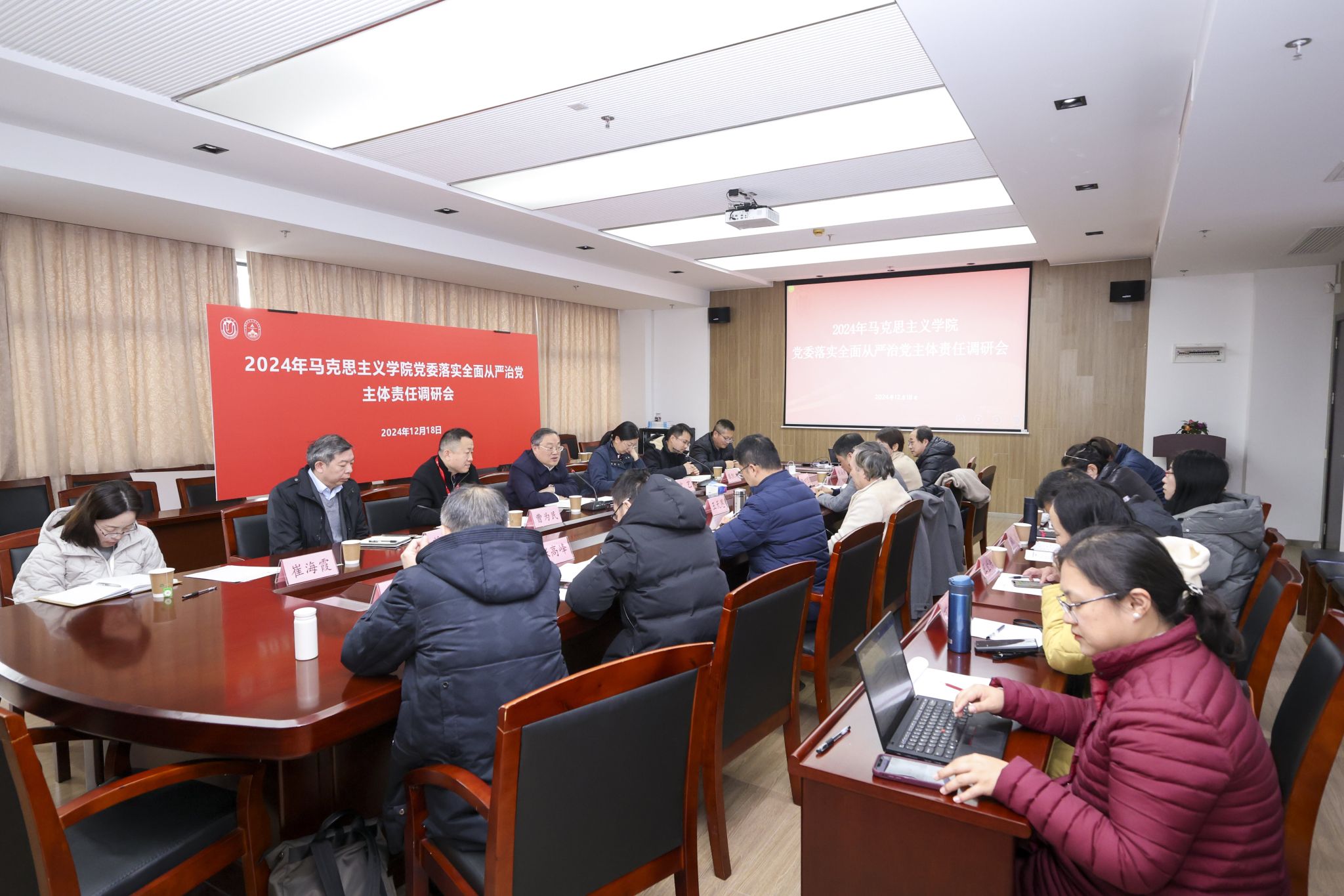 马克思主义学院党委书记王国建汇报了学院党委落实全面从严治党主体责任情况。他从学院党委履行管党治党责任、意识形态安全和校园安全责任、基层党建工作责任以及其他方面责任落实汇报了学院党委2024年主要工作和成效,同时汇报了存在的问题及原因分析以及下一步的工作计划。学院党委副书记、主持工作副院长叶海涛从学院对标校第四次党代会提出的“1+3+8”发展模式学院发展思路和具体落实举措、2024年KPI完成情况、“十四五”规划落实和十五五规划设想等方面汇报学院高质量发展情况。副院长焦成焕、高立伟分别就思政课选修课建设和研究生教学质量的提升两个方面做了补充发言。 各职能部处负责同志就马克思主义学院党委落实全面从严治党主体责任、意识形态阵地管理、党管人才、思政课建设、教师思政、党建品牌培育、做好上一轮巡察整改并做到未巡先改、廉洁文化建设等进行了交流,并提出了意见建议。 成旦红书记充分肯定了马克思主义学院2024年以高质量党建引领学院高质量发展所取得的成绩。他用“渐入佳境、可圈可点、未来可期”三个关键词表示对学院近年来发展态势的肯定和对未来的期许。他希望学院班子在今后发展中能够继续抓好高层次项目立项和高质量成果产出,激发每位教师的潜力,形成群体合力,向着建设全国重点马院的目标迈进。 |