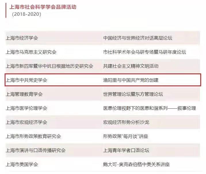 2022年3月1日召开的第十一次哲学社会科学学术团体工作会议,对获得“三优一特一品牌”称号的学术团体和优秀个人进行了表彰。上海市中共党史学会的“渔阳里与中国共产党的创建”荣获“上海市社会科学学会品牌活动(2018-2020)”荣誉称号。 “三优一特一品牌”是上海市社会科学界联合会开展的上海市优秀社会科学学会、上海市优秀民办社会科学研究机构、上海市优秀社会科学学会工作者、上海市社会科学学会特色活动、上海市社会科学学会品牌活动的评选工作,每三年评选一次,2018-2020年度的评选活动于2021年11月17日正式揭晓。上海市中共党史学会渔阳里研究专业委员会领衔主持的“渔阳里与中国共产党的创建”是继2018年荣获“2015-2017年度上海市社会科学学会特色活动”后,所获得又一项重大殊荣。 上海市中共党史学会渔阳里研究专委会由上海大学马克思主义学院教授李瑊老师担任主任,在她的带领下,渔阳里研究专委会已经成为上海社科界有影响的专业学会,取得的发展和成绩有目共睹,获得了社会各界的关注和好评。研究团队在“渔阳里”为核心的中共创建史的资料收集、研究和宣传方面做了许多工作,在发掘宣传“渔阳里”的工作中堪称拓荒者,做出了开创性的重要贡献。此次获奖,即是对渔阳里研究专委会工作的肯定。