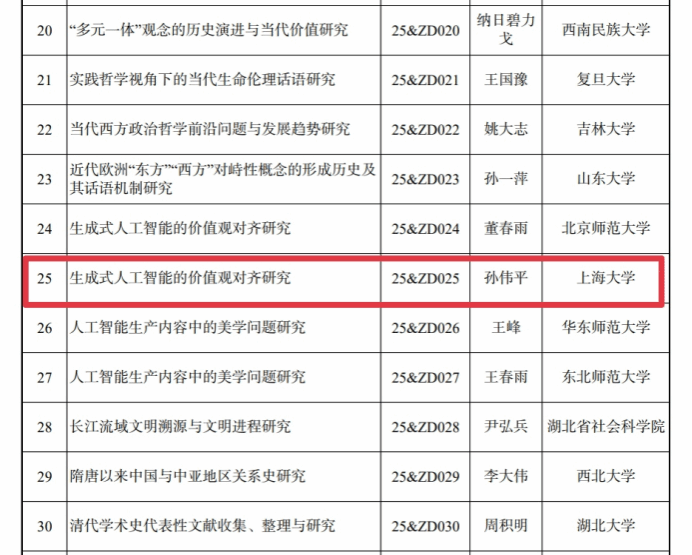 2025年12月19日,全国哲学社会科学工作办公室公布2025年国家社科基金重大项目立项名单。马克思主义学院孙伟平教授主持的《生成式人工智能的价值观对齐研究》(25&ZD025)获批国家社科基金重大项目立项!