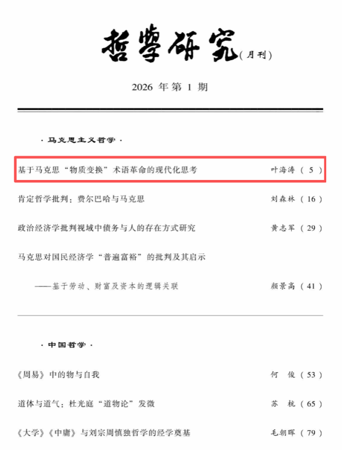 马克思主义学院叶海涛教授在《哲学研究》发表最新研究成果 近日,上海大学马克思主义学院叶海涛教授在《哲学研究》(2026年第1期)发表理论文章《基于马克思“物质变换”术语革命的现代化思考》。 文章指出:在最基本的人与自然关系层面,现代化就是特定社会历史形态下的“物质变换”过程。自1851年《伦敦笔记》中的《反思》至《资本论》问世的十多年间,“物质变换”概念经过历史唯物主义的批判性改造暨“术语的革命”,最终成为马克思分析批判资本主义现代化进程的核心范畴。资本主导下的西方现代化以雇佣劳动为中介,破坏了此前人与自然之间相对直接与和谐的“物质变换”样态,由此产生了一个无法弥补的“物质变换裂隙”,并伴随着资本的全球扩张造成了世界性生态危机。中国式现代化在反思西方现代化“物质变换裂隙”的进程中,摒弃以“资本为中心”的现代化模式,坚持“以人民为中心”的生态价值原则,坚守“绿水青山就是金山银山”的核心理念,推动了“物质变换”的生态重塑,取得了经济社会高质量发展与生态环境高水平保护的历史性成就,为解决现代化进程中的生态环境困境提供了中国智慧和中国方案。