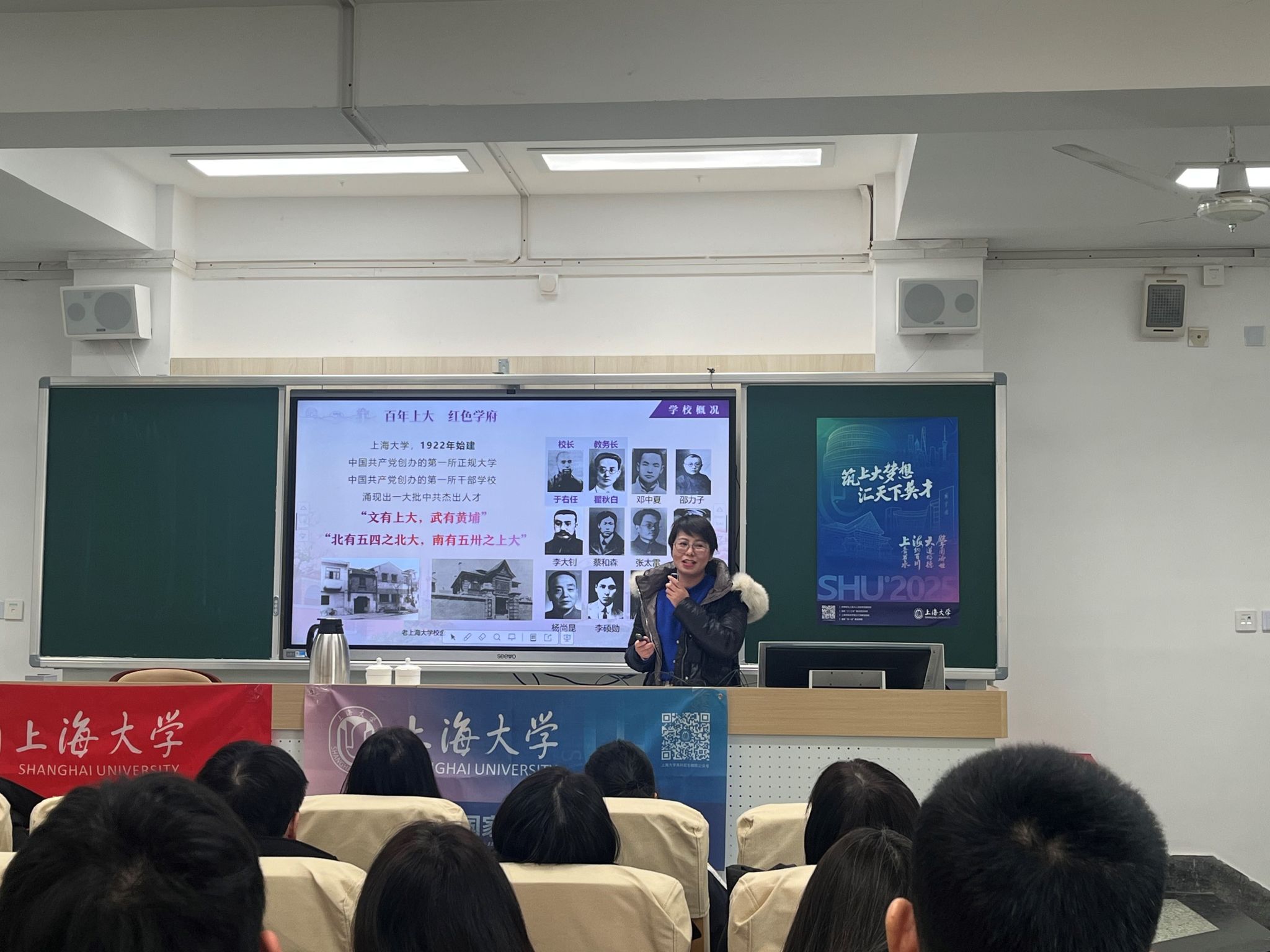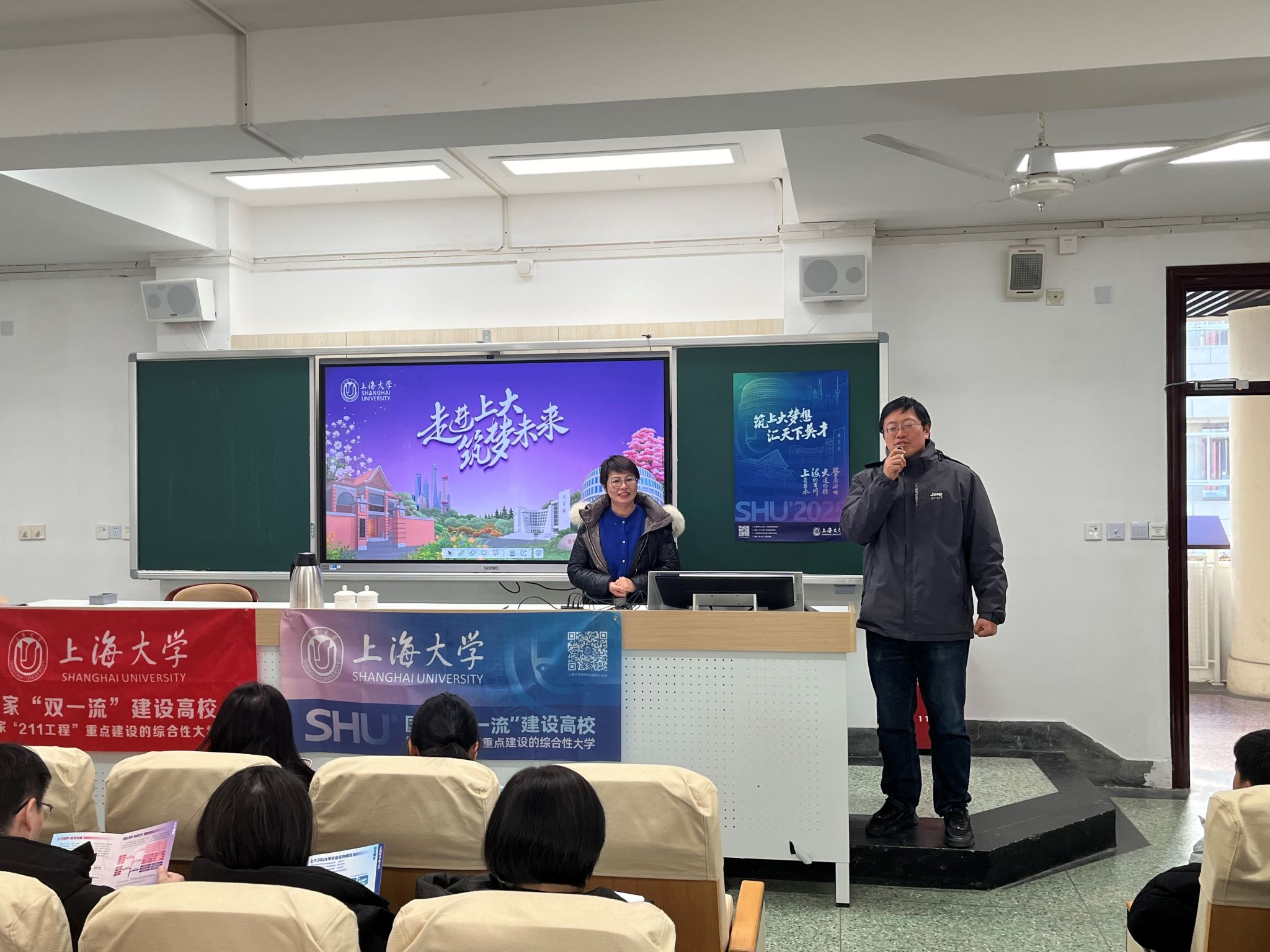 1月10日下午,上海大学招生就业处副处长卢欣,马克思主义学院党委副书记、副院长张印兰,招宣组教师黄丽娜以及“我为上大代言”寒假社会实践学生团队成员一行,前往上海市控江中学参加2025年校园开放日活动,并开展招生宣传与咨询。招生宣讲会由控江中学教导处副主任谈荣老师主持,百余位控江中学师生及家长参与了此次活动。