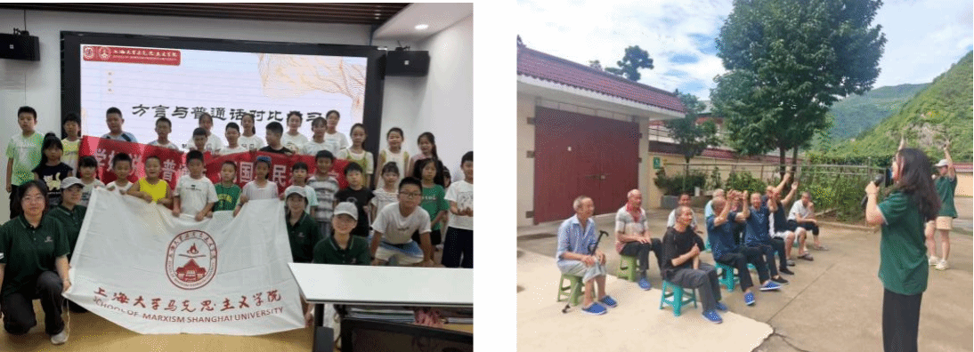 “上海大学乡村振兴推普先锋团”在金川县与柞水县深入乡村为老年人普及普通话,走进暑托班为小学生开展推普活动,既让成员真切感受到群众对学好普通话的迫切需求,也深刻认识到推普工作在助力乡村振兴、促进区域交流中的重要意义,进一步强化了成员的社会责任感与时代使命感。未来,推普先锋团将持续关注民族地区、边远地区的推普工作进展,在助力更多人跨越语言障碍、融入发展浪潮的征程中贡献青春力量,用青春接力书写推普助飞的时代答卷!(供稿:汪茂洋、吴雨娜、张芸梓、刘晨颖、刘思) |